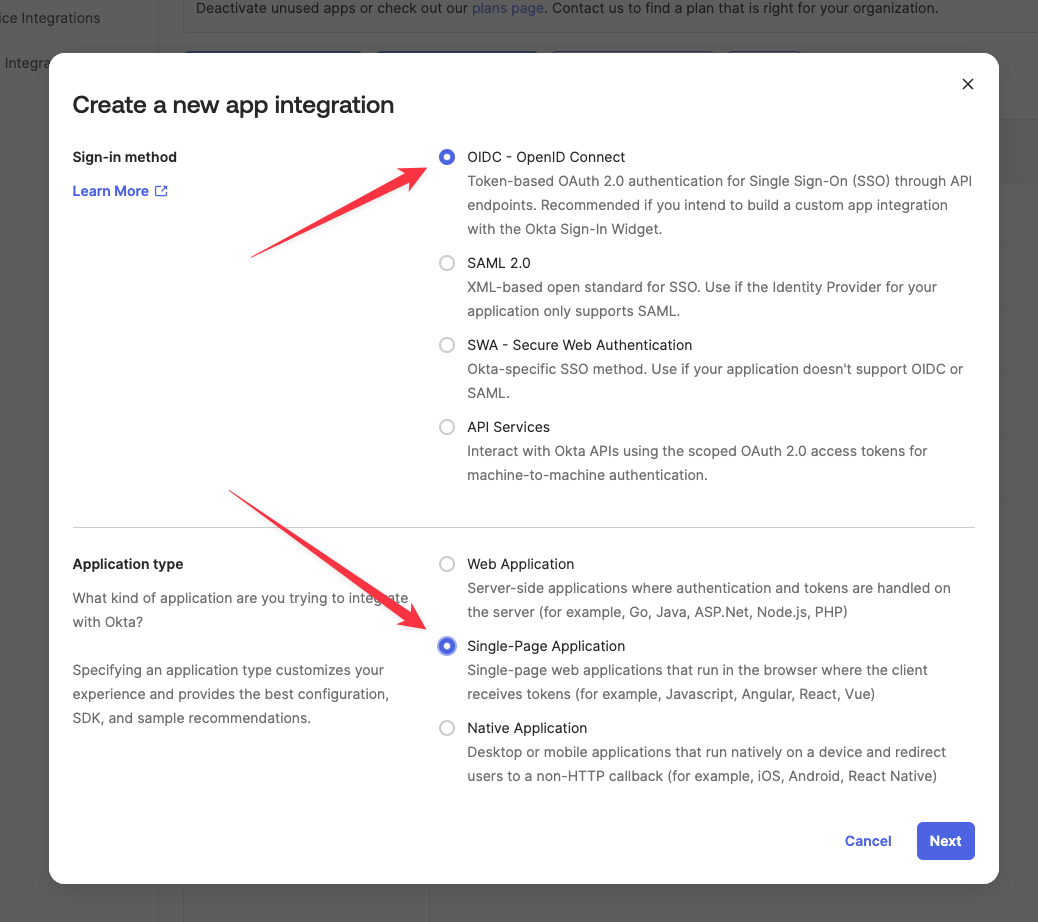 For Sign-in method, select OIDC - OpenID Connect. For Application type, select Single-Page Application, since we’ll communicate with this OIDC app from Webiny Admin app, which is a regular React single-page app. Then click Next.