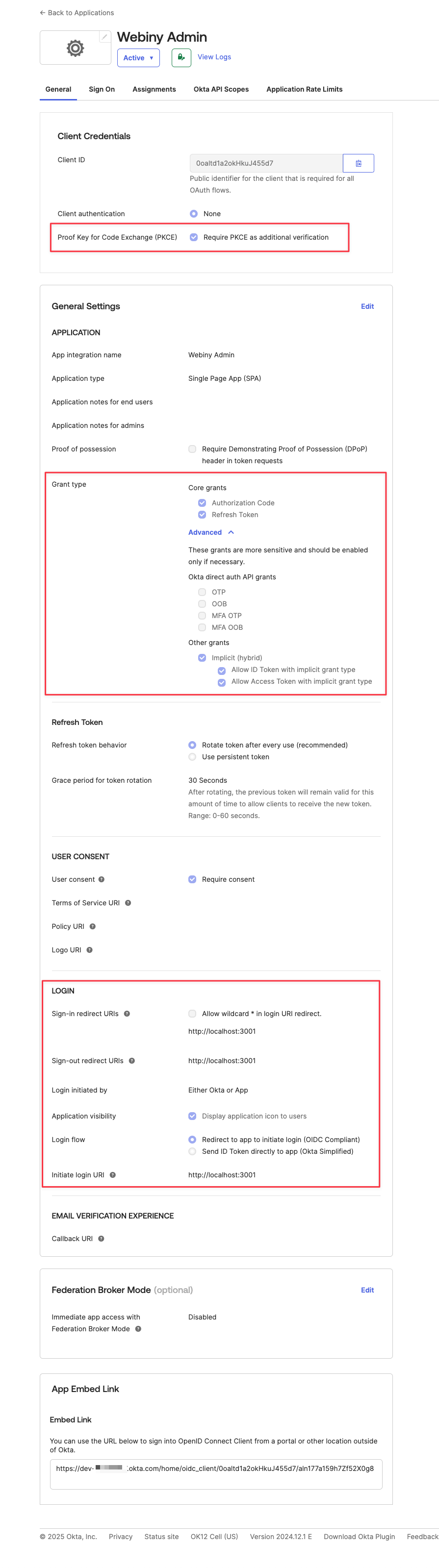 The following image shows the general configuration of your OIDC app, with the most important parameters highlighted in red. Use this as a starting point, to get your integration working end to end. Then you can go back and tweak parameters to your liking.