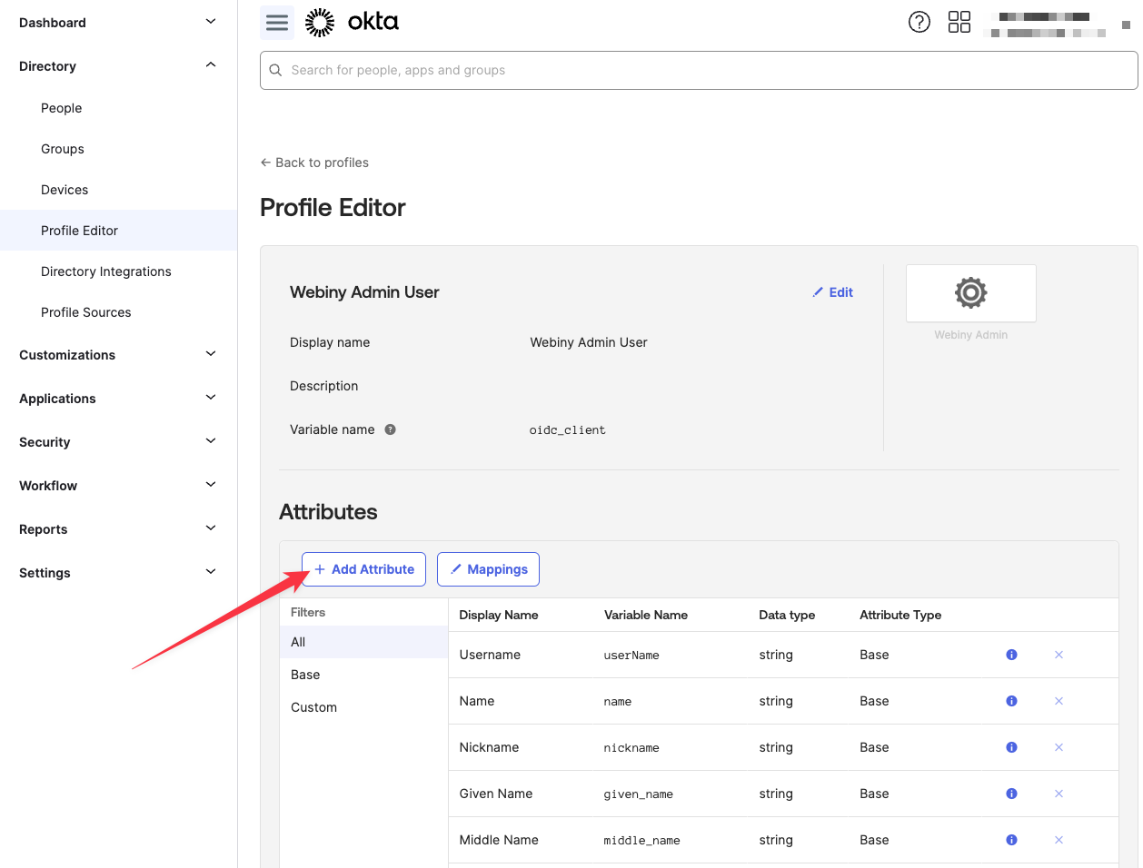 Navigate to Directory -> Profile Editor, find your OIDC app profile, and click it (click the profile name, not the “Mappings”, it’s a different thing).