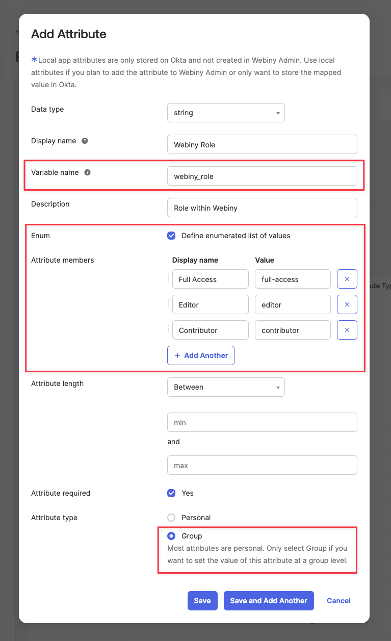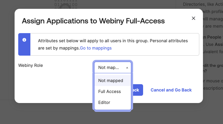 Okta will ask you to map the Webiny Role custom attribute we defined earlier. Select one of the predefined Webiny roles. All the users assigned to this Okta group, will automatically assume that particular Webiny role when accessing Webiny.