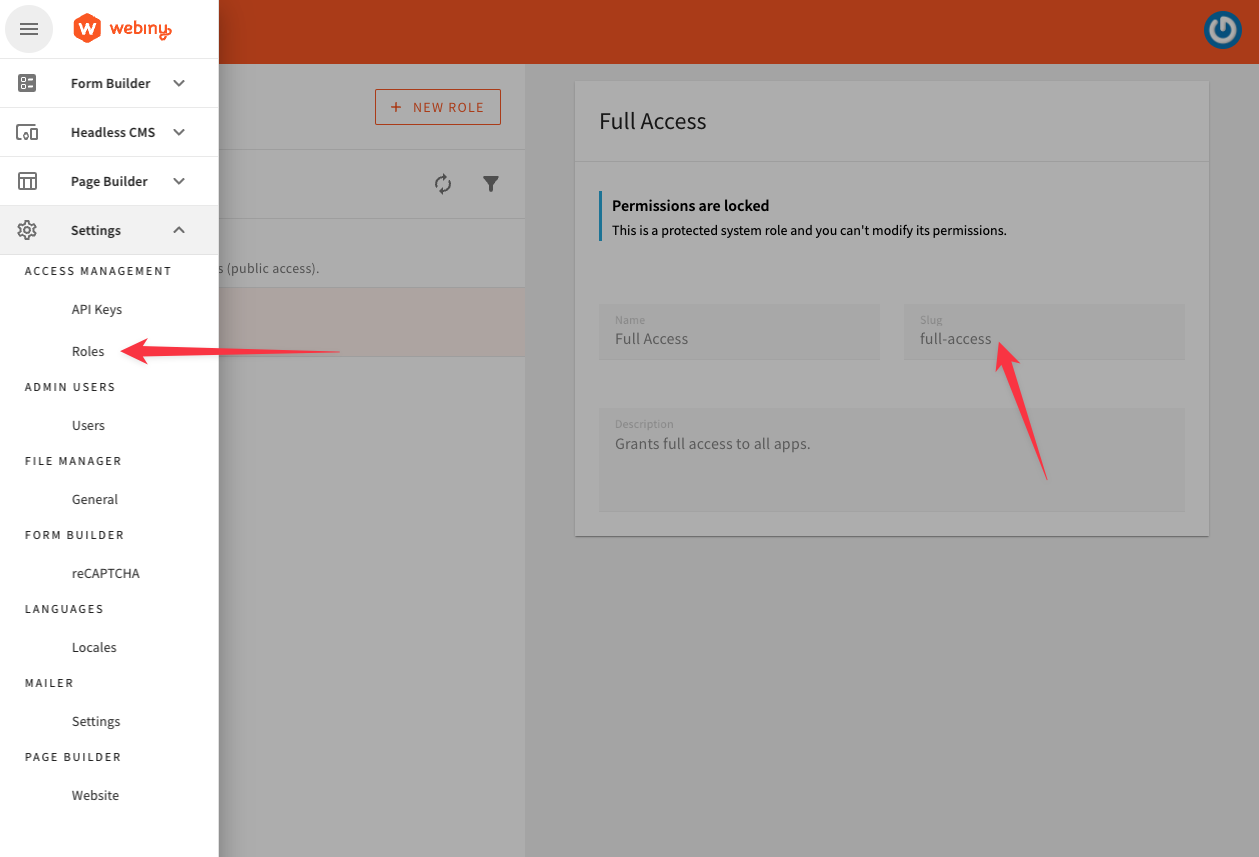 The value of roles are actually role slugs, taken from the Webiny Admin app. To manage Webiny Roles, navigate to Settings -> Access Management -> Roles in your Webiny Admin app.
