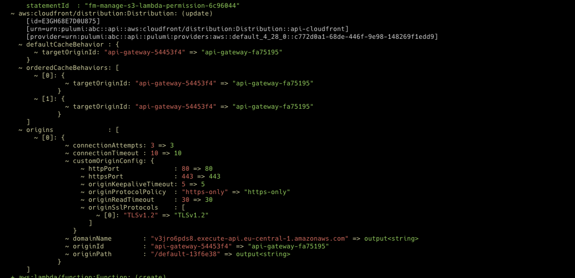 As we can see, we have changes in targetOriginId properties and within the origins property. Essentially, the existing Amazon Cloudfront distribution is just linked with the newly deployed API Gateway. If those are the only differences that the preview command showed, then we’re almost ready to deploy.